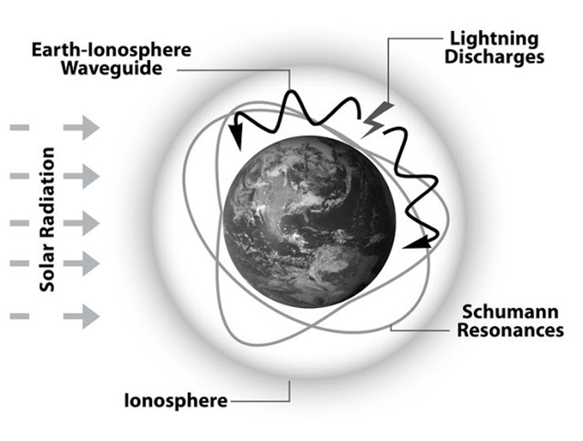 지구에는 슈만공명[1]이라는 고유한 파동이 있습니다. 이런 현상은 지구 외의 다른 행성에서도 관찰되는 것이라고 합니다. 슈만공명은 행성의 지표면과 전리층 사이에 있는 대기 공간 속에 공진하는 일종의 전자기파동입니다. 지구 표면은 음전하를 띄고 있고, 지구 대기권 밖 전리층은 자외선 방사로 엄청나게 양이온화가 되어 있습니다. 양이온은 지구의 음전하를 없애버리고도 남을 만큼 거대한 양이라고 합니다. 지구는 마치 양이온 바닷속에 방수복을 입고 있는 음이온 덩어리 같은 것이죠. 다행히 전리층과 지표면 사이에 대기층에는 전하를 띄는 물방울(에어로졸)이 별로 없기 때문에 전리층의 양이온이 지구 대기층으로 침투해서 땅으로 떨어지는데 큰 저항을 받는다고 합니다. 그래서 지구표면은 안전히 음전하를 띄며 양이온으로부터 보호받을 수 있는 것이죠. 하지만 대기층이 완전한 절연체가 아니기 때문이 전리층 양전하가 지표면으로 미세하게나마 떨어져 내리고, 이 양은 비록 미세한 양이지만 천문학적인 수준이라서, 역시 그 양을 다 합치면 아마 10 분만에 지표면의 음전하가 없어지는 정도가 될 거라 합니다. 하지만 지구는 이를 해결하며 버티고 있습니다. 바로 천둥번개로 말이죠. 지구에는 하루에도 백 번이 넘는 번개가 칩니다. 천둥번개는 지표면으로 음전하를 한꺼번에 내리 꽂는데 반대급부로 동시적으로 순식간에 엄청난 양의 양전하가 하늘로 던져져 올라간다 합니다. 지표면 음이온 유지가 가능했던 것은 이 무서운 이런 천둥번개 덕이었던 거죠. 이때 나는 엄청난 천둥소리가 바로 슈만공명과 관계가 있습니다. 번개 덕분에 발생한 파장에 의해 대기층은 충격을 받아 스피커 표면이 떨리듯 진동하게 됩니다. 도파관 역할을 하는 것입니다.