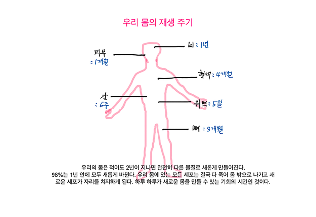 우리 몸의 각 장기들은 세포의 구성물질을 변경하는 주기가 다 다르기 때문에 약 2년 정도가 지나야 완전히 다른 물질로 우리 몸이 재구성되어 대체 된다고 합니다. 우리 몸은 지난 2년간 내가 먹은 것으로 만들어진 결과물입니다. 그리고 그 결과물은 내가 받아들이는 정보를 내 나름의 처리하는 방식에 따라 구성 되었습니다.