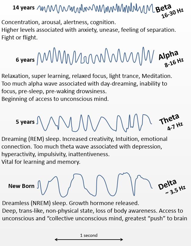 태어나서 6-8세까지는 프로그래밍이 완료됩니다. 6세 이하의 아이들은 뇌파상태가 주로 세타 (Theta)파(4~7Hz) 상태라고 합니다(그림 A). 느린 뇌파입니다. 이런 느린 뇌파는 새로운 정보가 꽂힐 수 있는 여유로운 상태, 예를 들면 깊은 명상이나 최면상태입니다. 들어오는 정보를 그대로 받아들이는 정보 입력 상태입니다.