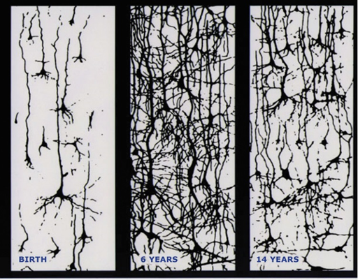 어렸을 때는 뇌 속의 신경세포들이 서로 연결이 많이 되어 있지 않은 순수한 상태입니다(그림B, 왼쪽 그림). 이때는 외부 자극이 많이 축적되지 않은 상태이기 때문에 신경세포들끼리 주고받는 정보가 그리 많지 않습니다. 그러므로 주로 내면세계에 의식이 머물러 있습니다. 대신 새로운 정보가 입력되면 그 정보에 의해서 신경세포를 통해 지나간 길이 생겨납니다. 백지에 첫 줄을 긋는 것처럼, 아마도 강렬한 첫 경험으로 길이 날 것입니다. 그래서 아이들은 최면상태에서 걸어 다니는 것과 같습니다. 아기들은 부모가 만들어주는 환경이 주는 메시지를 아무 비판없이 받아들입니다. 벌레가 징그럽다고 배우면, 평생 벌레는 징그러운 것이지만, 귀엽다고 배우면 평생 귀엽게 느껴집니다. 이때 개한테 물린 경험이 있으면 개 공포증에 시달릴 수 있지만, 이 시기 강아지와 함께 자랐다면 강아지는 사랑스러운 반려동물입니다. 이 시기에 외국어에 노출되면 큰 애씀 없이 외국어를 모국어처럼 구사할 수 있습니다. 이 시기에 하는 경험은 안전함과 안전하지 않음, 편함과 불편함에 대한 구분 없이 모든 것을 그대로 받아들입니다. 그것이 좋은 것이든 나쁜 것이든, 그대로 자국으로 남습니다. 그리고 자극들은 뇌에 수많은 신경통로를 만듭니다. .